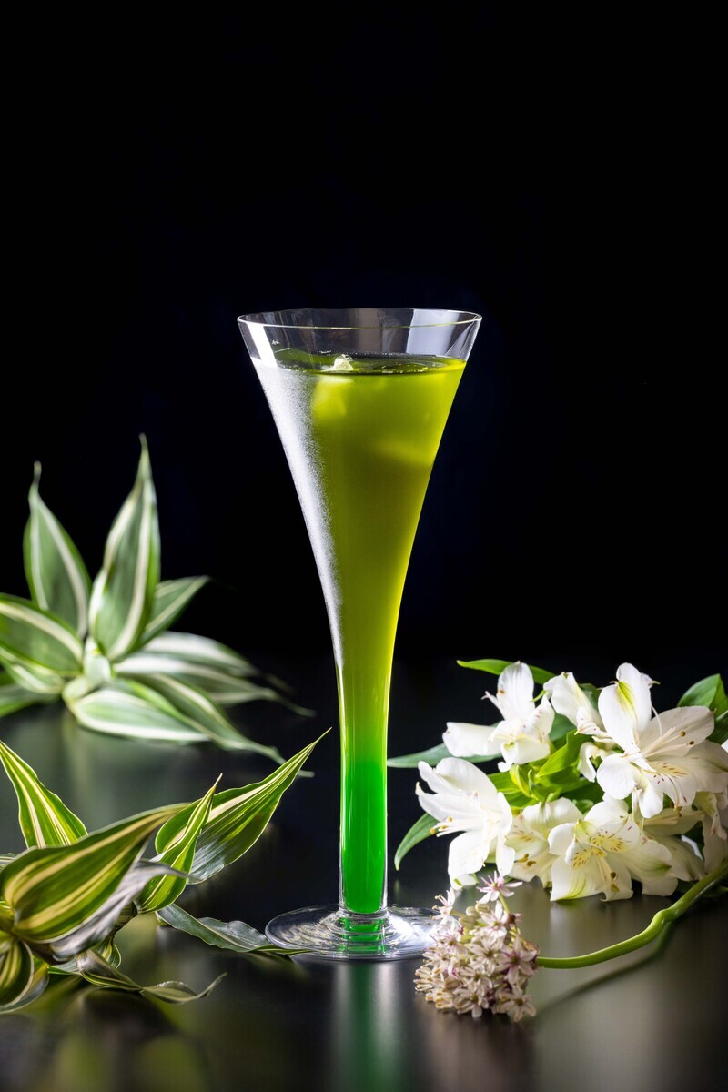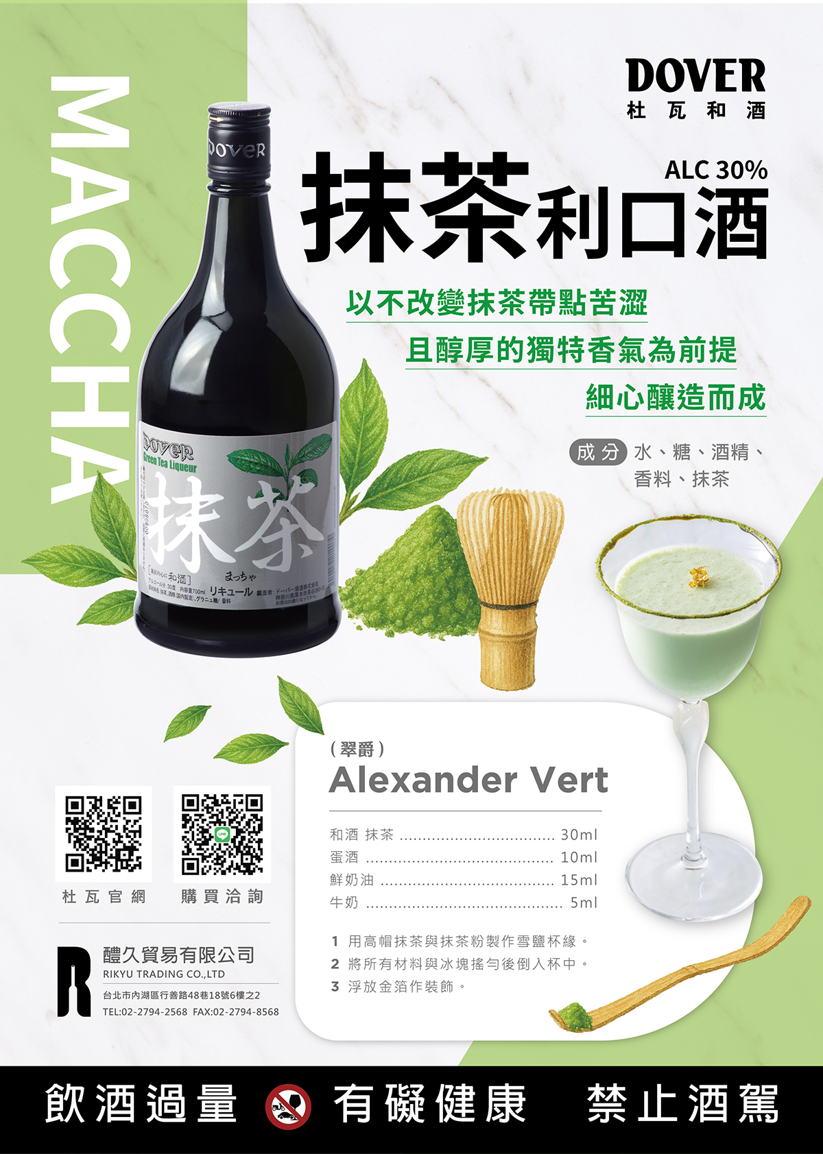 杜瓦和酒【抹茶酒】不去改變抹茶所具備獨特的澀味與爽快的香氣,另外蘊含的藥用成分單寧、維他命C和咖啡因都直接保留製作而成,為天然的濃綠色,只要一點點綠就能把產品妝點得更出色,還維持濕潤的光澤並防止乾燥。這傳統的風味就誕生在這全新的世界中。