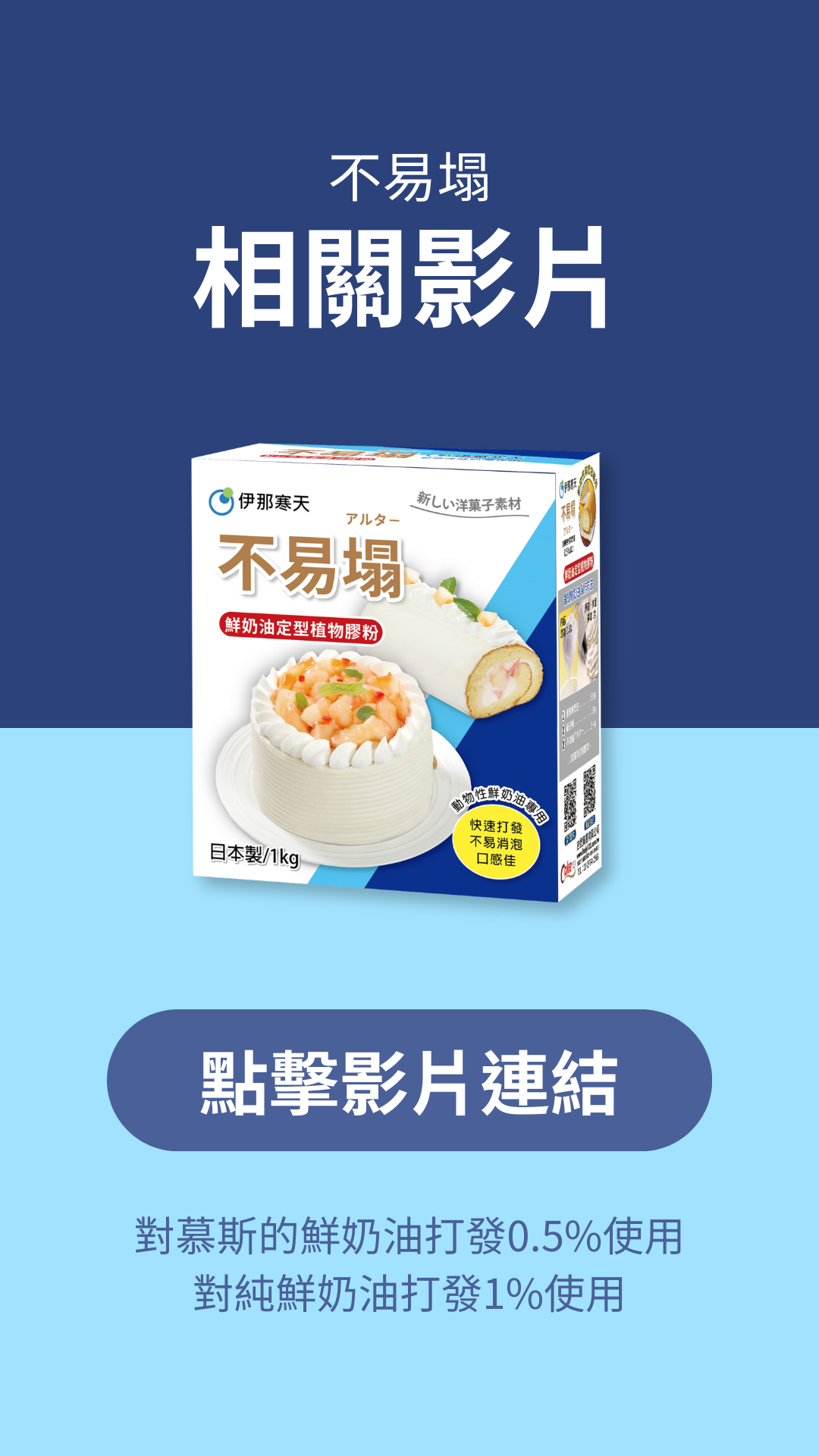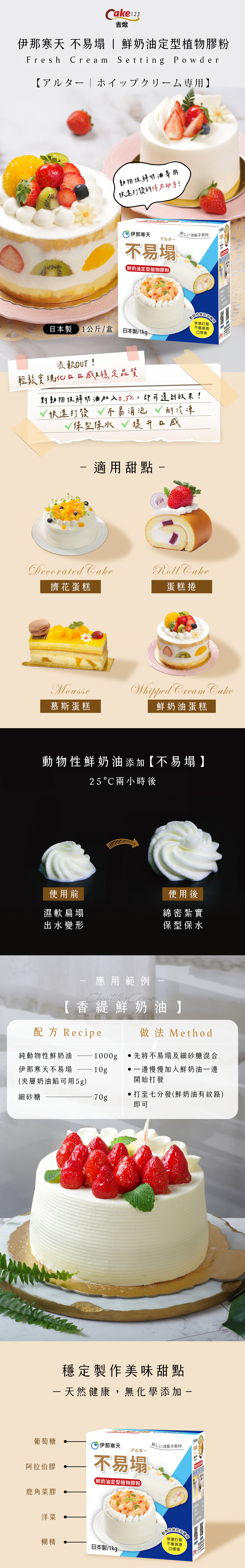 鮮奶油容易融化變形?伊那寒天【不易塌-鮮奶油定型膠粉】是一款幫助動物性鮮奶油穩定的植物膠體,讓鮮奶油蛋糕即便使用香醇的純動物性鮮奶油也不會有塌陷或融化等問題。 保型、保水、快速打發、不易消泡、耐凍不龜裂、口感佳,是專業蛋糕店必備的秘密武器!