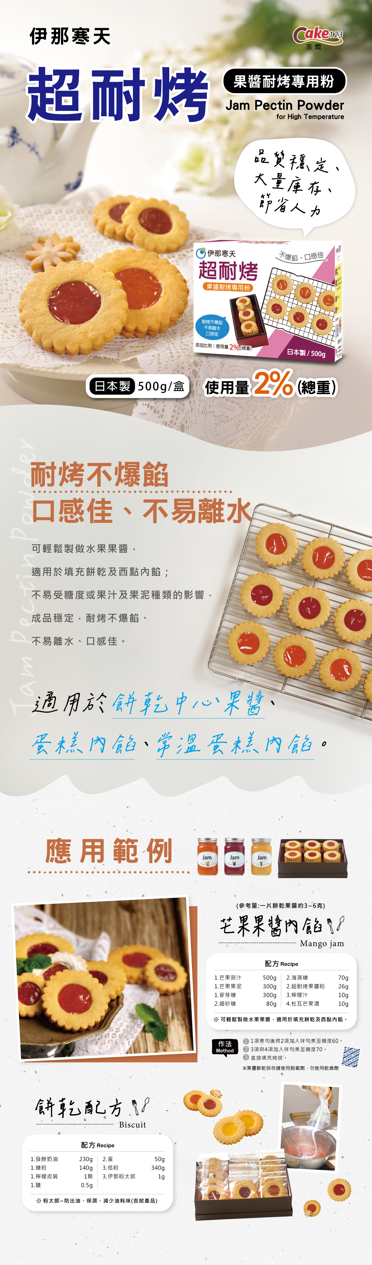 餅乾的果醬容易變硬?伊那寒天【超耐烤 - 果醬耐烤專用粉】可用於製作果醬餅乾,雖與一般果膠粉用法相同,卻相對柔軟、保濕,更能表現果醬的口感,且具有耐烤不爆餡的特性。用量僅需2%,即可製作出擁有自己特色的果醬。