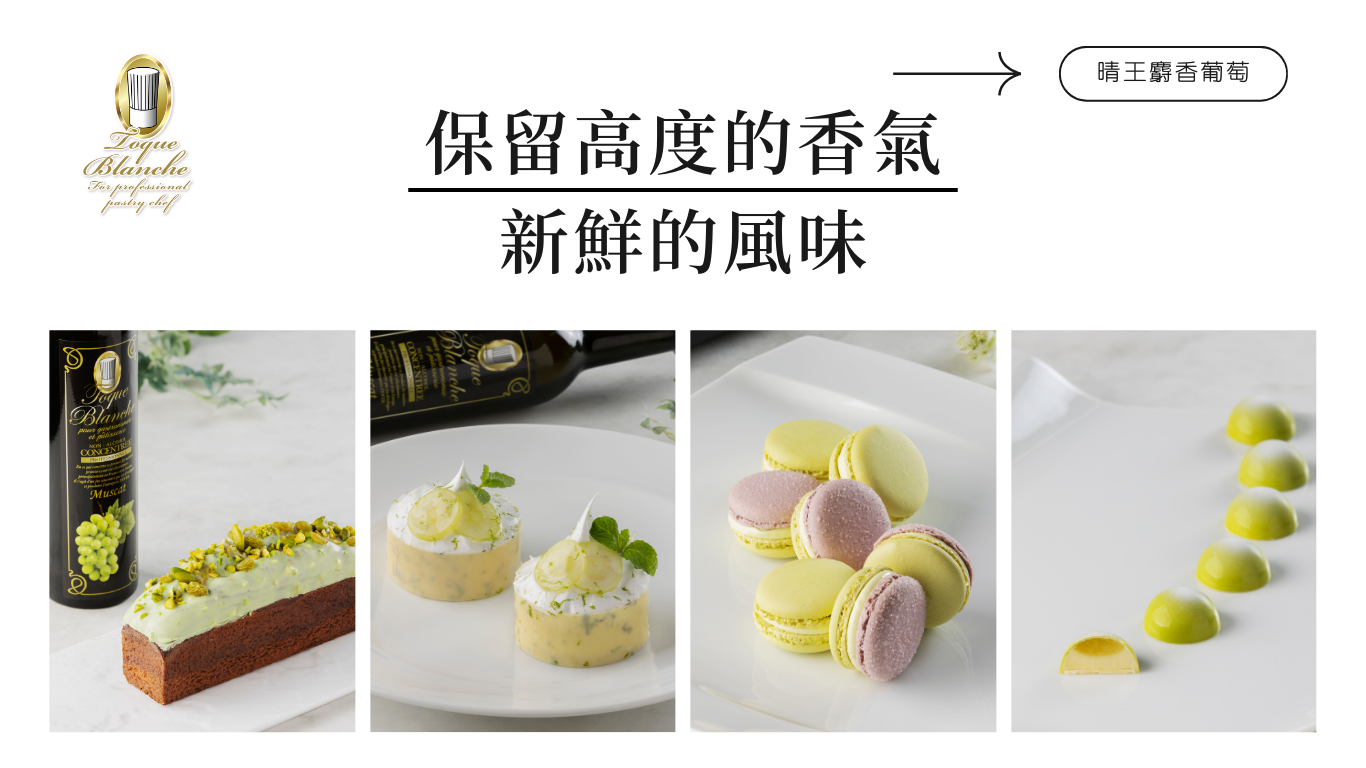 【杜瓦高帽 - 麝香葡萄萃取液】使用大量日本國產晴王麝香葡萄,將濃厚且新鮮的風味萃取出來。高雅且鮮明的味道,使其能夠廣泛運用於各種甜點、飲料及料理當中。